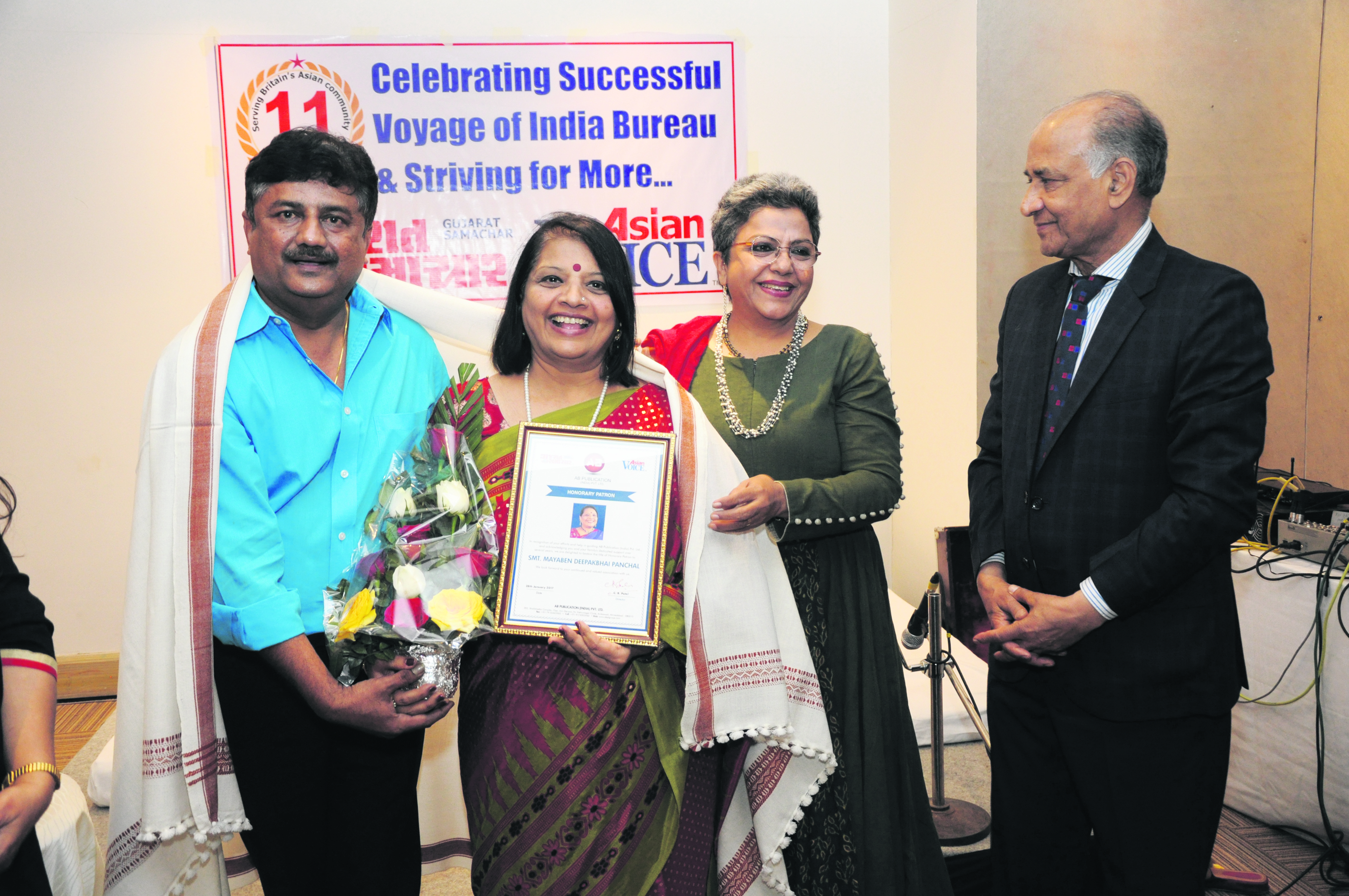 Celebrating 11 years of success of the Indian Bureau of Asian Voice and Gujarat Samachar (UK), ABPL Group held a dazzling evening filled with laughter and warm camaraderie. Publisher/Editor CB Patel, who was on his annual visit to India commenced an event that saw journalists, writers, political leaders, and well wishers in attendance. The anniversary day actually falls on 16th February.