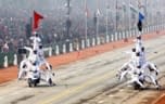 A spectacular flypast by the IAF commenced with the ‘Chakra’ formation, comprising three Mi-35 helicopters in ‘Vic’ formation, followed by the ‘Hercules’ formation comprising three C-130J Super Hercules aircraft in ‘Vic’ formation. A breath-taking ‘Trishul’ formation comprising three Su-30 MKI of No. 24 Squadron flew over the Rajpath, and once in front of the saluting dais. Trailing them was the ‘Globe formation’ comprising one C-17 Globemaster flanked by two Su-30s, followed by the fighters, where five Jaguars flew in Arrowhead formation, another five MiG-29 Air Superiority Fighters called the ‘Tridents’ flew in Fulcrum style.