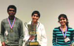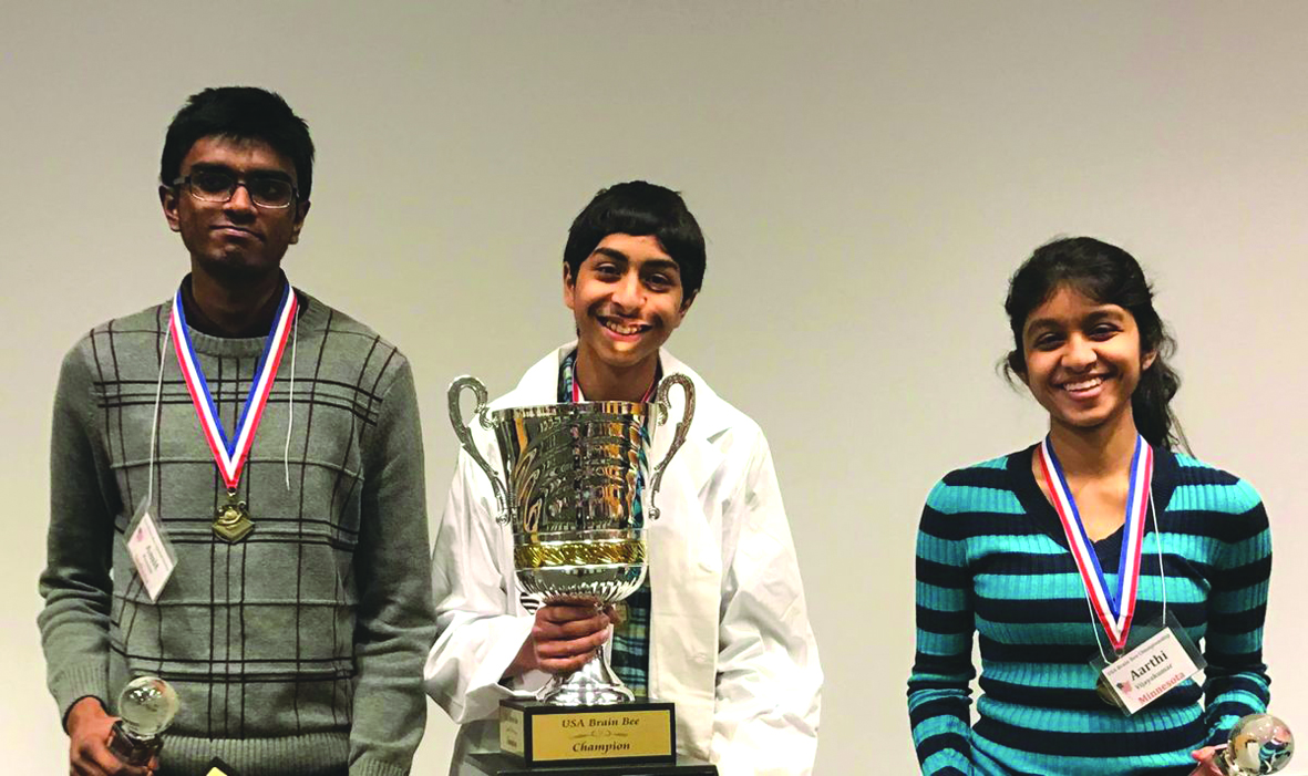 The top three winners of the USA Brain Bee Championship this year are all Indian American student (l-r): Amit Kannan, who came in third place; winner Sojas Wagle; and runner-up Aarthi Vijayakumar.