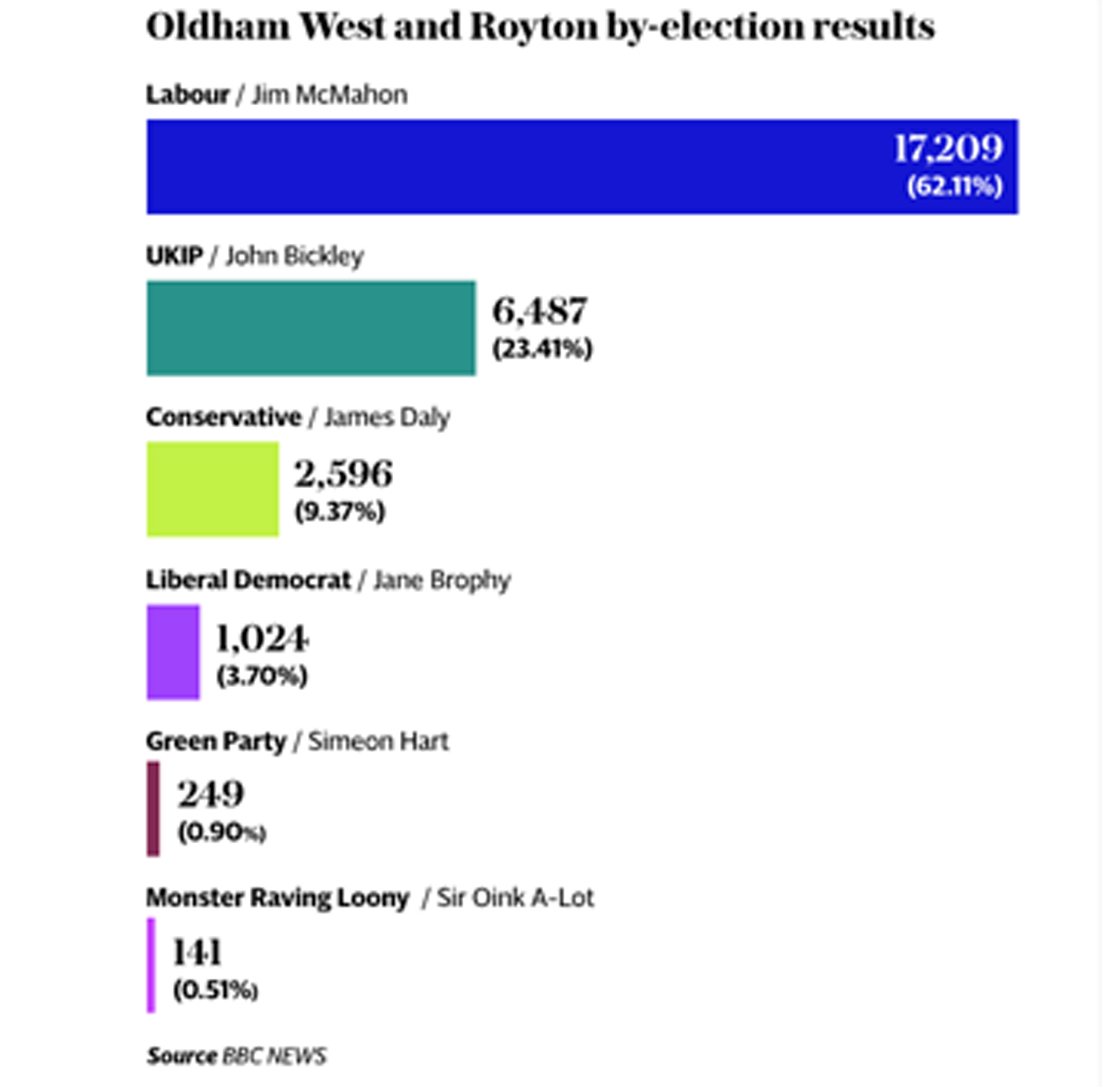 While the Labour Party rejoiced the victory of MP Jim McMahon, the defeat of UKIP's candidate, John Bickley has not gone down well with his party; the party allegedly complained that the contest was “bent”.