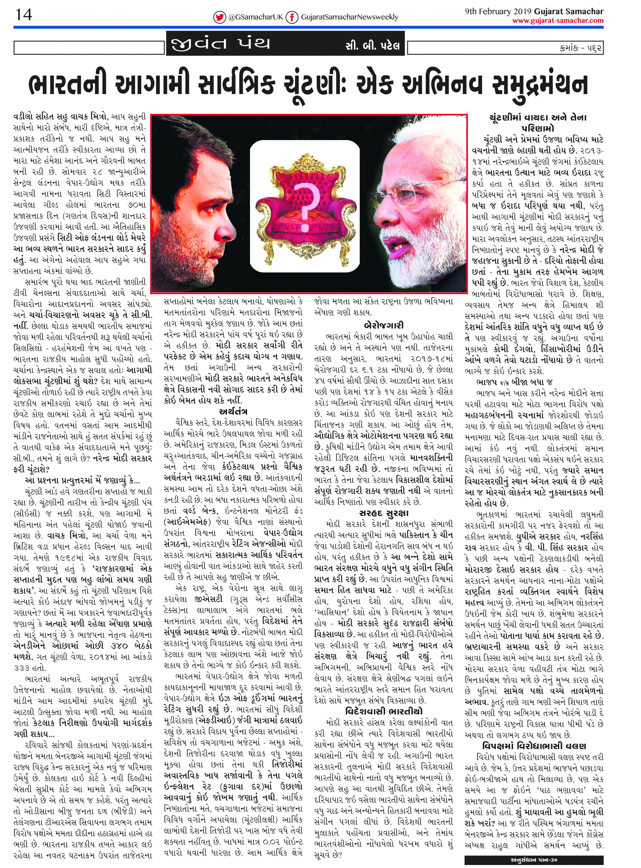 When the Lok Sabha elections process began in India, everybody had this question: will it be NDA, Congress or 'Mahagathbandhan' which will have an upper hand in the 17th Lok Sabha? Indians across the nation and overseas projected many opinions on that matter. In January 2019, CB Patel, the editor-publisher of Gujarat Samachar and Asian Voice, in his 'Jeevan Panth' column predicted that NDA under the leadership of Prime Minister Narendra Modi will come back to power with minimum 340 seats.