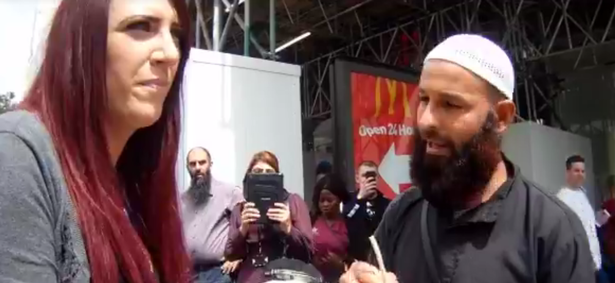 Ms Fransen can be heard telling the stallholder that she knows the purpose of him being there is trying to spread to word of Islam, to which the stallholder replied that he ‘wanted to help people get to paradise’.