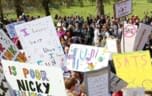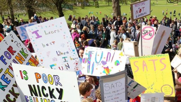 The protest, organised by the Let Our Kids Be Kids campaign, complained of a damaging culture of over-testing, saying children are "over-tested, over-worked and in a school system that places more importance on test results and league tables than children's happiness and joy of learning".